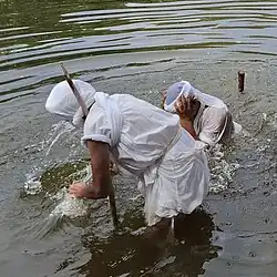 Mandaeans revere John the Baptist and practice frequent baptism (masbuta) as ritual purification, not of initiation. They are possibly one of the earliest peoples to practice ritual baptism.[5] Mandaeans undergo baptism on Sundays (Habshaba, Classical Mandaic: ࡄࡀࡁࡔࡀࡁࡀ[6]), wearing a white sacral robe (rasta). Baptism for Mandaeans consists of a triple full immersion in water, a triple signing of the forehead with water (in which the priest puts his fingers on the baptized person's forehead and moves it from right to left), and a triple drinking of water. The priest (rabbi) then removes a ring made of myrtle (klila) worn by the baptized and places it on their forehead. This is then followed by a handclasp (kušṭa, "hand of truth") with the priest, using right hands only. The final blessing involves the priest laying his right hand on the baptized person's head.[7]: 102