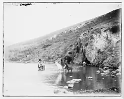In the 19th century, Arthur Penrhyn Stanley, in his 1856 book Sinai and Palestine, similarly associated Ain Jalut with the "Spring of Jezreel", and also suggested that this could be the same site as En Harod, a place mentioned in the story of Gideon's battle with the Midianites.[17] The name "Harod" translates literally as the "spring of trembling (or anxiety)",[17][18] a toponym thought to have been used "as a literary illusion to the fear and anxiety of the warriors" ahead of the battle.[18] Stanley noted that the then modern name, "Ain Jahlood" or "Spring of Goliath" may have originated, as observed by Carl Ritter in his 1866 geography of Palestine, from a confused recollection of the earlier stories, but "more probably arose from a false tradition in the 6th century".[17] He separately noted the suggestion by Rabbi Joseph Schwarz, in his 1850 Descriptive Geography of Palestine, that the name "Jalud" could instead be derived from the name "Gilead". Schwarz suggested that this might reminisce an older name for Mount Gilboa, and thus explain the cry of Gideon ahead of his battle: "Whoever is fearful and afraid, let him return, and depart early from Mount Gilead." Schwarz alternatively explains "Mount Gilead" as a "general phrase for the whole tribe" of Manasseh.[17] George Adam Smith, writing in 1920, also noted the similarity of "Jalud" with "Gilead".[19]