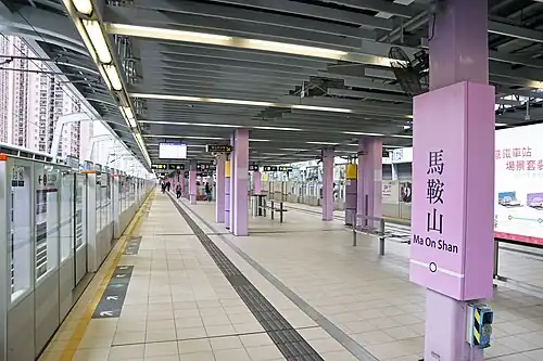 Ma On Shan (Chinese: 馬鞍山) is an elevated station on the Tuen Ma line of Hong Kong. It is located above Sai Sha Road, at the town centre of Ma On Shan, between Sunshine City and Bayshore Towers. It also serves other residential areas like Kam Ying Court and Chung On Estate; it also serves over ten schools, and is in close proximity with Ma On Shan Park and other parks.
