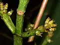 This plant has a mutualistic relationship with predatory ants of the Crematogaster genus. The tree has hollow twigs in which the ants make their nest and provides the ants with food bodies located on the leaf stipules; the ants feed on these and defend the tree against herbivorous insects.[5] Many fewer food bodies are produced by trees that have no ants inhabiting them than are produced by those where ants are present.[5]