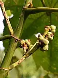 A small, spreading tree, M. triloba grows to a height of about 20 m (66 ft). The trunk is a light greyish-brown with smooth bark, and the twigs and shoots are largely devoid of hairs. The leaves are tri-lobed and peltate, with toothed margins. Each leaf has two erect, leathery stipules that are ovate, slightly recurved and do not encircle the stem. The inflorescence is a panicle with minute reddish-brown flowers. The fruits are rounded, sticky and yellow when ripe, the carpels developing long, horn-like processes. The fruits are about 12 mm (0.5 in) long and 7 mm (0.3 in) wide.[2]