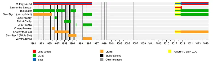 - Muttley McLad, (real name Tristan O'Neill) - lead vocals, bass, songwriting (1981–1995; 1997; 2018–present)