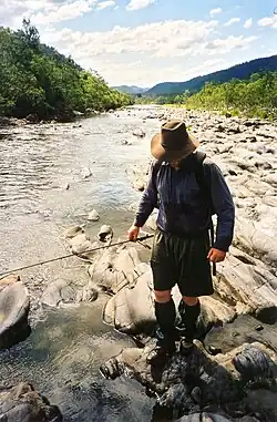 Several genetic studies have found that eastern freshwater cod, in the southernmost of these four rivers, and Mary River cod, in the northernmost of these four rivers, are more closely related to each other than to Murray cod.[5][6][7] This suggests that Murray cod only managed to cross into east coast river systems once. It is not clear which of the four river systems was the original entry point, but geomorphological evidence suggests the headwaters of the Clarence River.[5] The mechanism by which Murray cod crossed the Great Dividing Range are considered to be either river capture, where the headwaters of an easterly-flowing coastal river cuts back (in the erosional sense) and intercepts and "captures" the headwaters (and fish fauna) of a previously westerly flowing stream, or a "wet divide", where extreme flooding or a very wet climatic phase created swamps in a topographic low point that effectively connected the headwaters of western flowing and eastern flowing streams.[8][9]