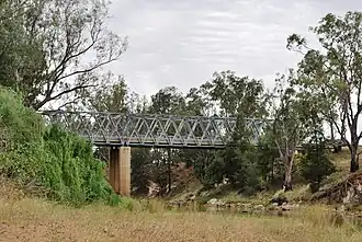| Trangie | Gin Gin Bridge | A standard Callendar-Hamilton truss bridge, prefabricated in England for the Department of Main Roads. The 101-metre-long (331 ft) bridge was opened in February 1963. | ||