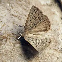 The ground colour is whitish fawn and the forewing has two dotted crosslines. The wingspan is 27–30 mm. The length of the forewings is 13–14 mm. The moth flies in one generation from late May to August [1].