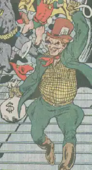 In his first appearance as the Mad Hatter, Tetch attempts to steal a trophy from the Gotham Yacht Club, and begins a crime spree that ends when he is foiled by Batman while he is trying to rob spectators from a high society horseshow.[3] Tetch is subsequently sent to Arkham Asylum (although his fate is not revealed until Detective Comics #510).[12] The Mad Hatter is not seen again in the Golden Age of Comic Books.