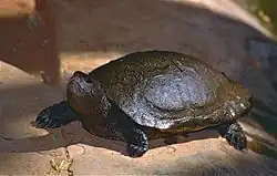 The Madagascan big-headed turtle (Erymnochelys madagascariensis)[1] is a turtle native to the waters of permanent slow moving rivers and lakes in western Madagascar. These turtles are critically endangered and have been evaluated to be the most endangered turtle in the world by a 2018 review.[3] Due to its ancient origins and threatened status, it is ranked as #1 on the EDGE of Existence programme's list of priority reptiles.[4]