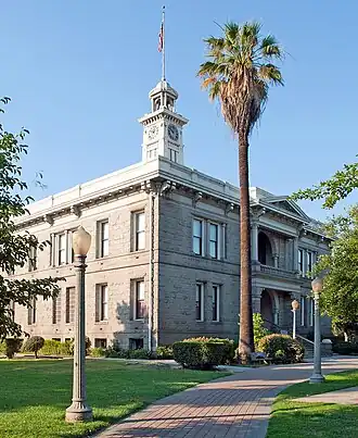 The Madera County Courthouse is the former county courthouse of Madera County, California. The courthouse is located at 210 W. Yosemite Ave. in Madera. It was built in 1900 using granite quarried within the county. The courthouse was the first significant public building constructed in Madera County. The building is topped by a clock tower; the tower fell in a 1906 fire but was rebuilt. In 1953, the county government left the courthouse, as a survey found the building to be unsafe.[2] The Madera County Historical Society later converted the courthouse into a museum.[3]