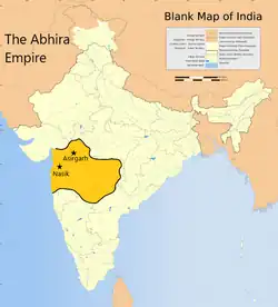 3. ^ Maharashtra (India). Gazetteers Department (1976). Maharashtra State Gazetteers: Buldhana. Director of Government Printing, Stationery and Publications, Maharashtra State, 1976. p. 52. About A.D. 250 the Satavahanas were supplanted by the Abhiras in Western Maharashtra and by the Vakatakas in Vidarbha. The founder of the Abhira Dynasty was Rajan Ishvarasena, the son of Shivadatta, who has left an inscription in Cave IX at Nasik.