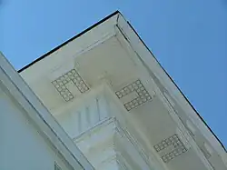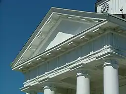 Above the central block and in line with the two wings rises a tall octagonal cupola, with four clock faces located respectively on each of the cardinal sides, just above its base. It is marked at each of its eight corners by an engaged Ionic column. Large sash windows punctuate the south façades and, originally also the east and west ends of the two smaller wings. Today the exterior constitutes the only part of the structure that retains the Greek Revival details. The portico sports a thin two-banded architrave and above that a prominent yet severe frieze of triglyphs separated by bare metopes; an additional bay is allotted for the central intercolumniation. Heavy modillions with guttae adorn the raking cornice and pediment that crown this part of the structure.