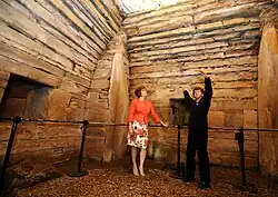 This entrance passage is 36 feet (11 m) long and leads to the central almost square chamber measuring around 15 feet (4.6 m) on each side.[8] The current height of the chamber is 12.5 feet (3.8 m), this reflects the height to which the original stonework is preserved and capped by a modern corbelled roof. The original roof may have risen to a height of 15 feet (4.6 m) or more.[9] The entrance passage is only around 3 feet (0.91 m) high, requiring visitors to stoop or crawl into the central chamber. That chamber is constructed largely of flat slabs of stone, many of which traverse nearly the entire length of the walls. In each corner lie huge angled buttresses that rise to the vaulting. At a height of around 3 feet (0.91 m), the wall's construction changes from the use of flat to overlapping slabs creating a beehive-shaped vault.[10]