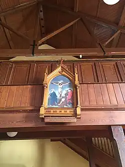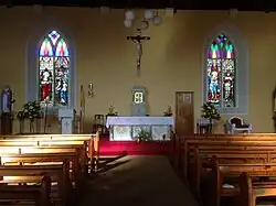 The Ss. Peter & Paul church still includes an intricate wooden ceiling. Constructed on an east–west axis, facing the rising sun (a symbol of Christ - The Celtic cross features the rising sun, a Celtic symbol, fused with a cross, as a symbol of the new Christian faith conquering the ancient pagan one), the building is renowned for its light and spaciousness. Its Turnerelli altar and side altars, redoros, mosaics, galleries and pipe organ, were all lost. Two stone crosses were also removed from the pinnacles of the exterior gables and replaced with iron crosses.