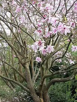 It is a small, ornamental deciduous tree that can grow to heights of 20 m. Leaf shape is obovate to elliptic-obovate, 7.5–14 cm-long, and is bright green above and glaucous underneath. The white to reddish flowers are large (16–25 cm wide), fragrant, and appear before leaves.[3] It was first discovered in western Sichuan in 1869 by Père Jean Pierre Armand and was introduced in western cultivation in 1908, when E.H. Wilson sent seeds from plants growing near Kangding, Sichuan, to Arnold Arboretum in Jamaica Plain, Massachusetts. They are, however, rarely cultivated.