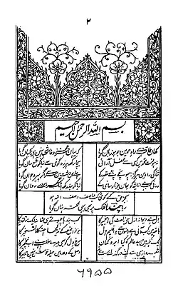 Mah Laqa was influenced by the literary work of mystic poet Siraj Aurangabadi (1715–1763),[2]: 121 [17]: 4109 and learned poetry from Nawab Mir Alam who later became the Prime Minister of Hyderabad State. Her first language was Urdu, and she was also fluent in Arabic, Persian and Bhojpuri languages.[4]: 118 & 123 She was the first woman poet to author a diwan, a complete collection of Urdu ghazals. The collection, named Gulzar-e-Mahlaqa, comprises 39 ghazals, and each ghazal consists of 5 couplets. The collection was published in 1824 after her death.[2]: 121–2 [18] The Diwan e Chanda is a manuscript collection of Mah Laqa's 125 Ghazals, compiled and calligraphed by her in 1798. It was signed and gifted to Captain Malcolm on 18 October 1799, during a dance performance at Mir Alam's residence. It is now preserved in the British Museum.[19][20]: 521–2