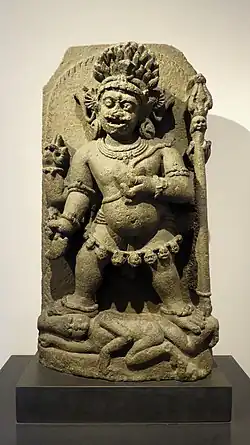Mahakala is also known as Mahakala Bhairava in Hinduism, often depicted with four arms and three eyes, he is associated with time, creation, destruction, and power.[8] Many temples in India and Nepal are dedicated solely for Mahakala Bhairava, for example at the temple in Ujjain, which is mentioned more than once by Kālidāsa. The primary temple, place of worship for Mahakala is Ujjain. Mahakala is also a name of one of Shiva's principal attendants (Sanskrit: gaṇa),[9] along with Nandi, Shiva's mount and so is often represented outside the main doorway of early Hindu temples.