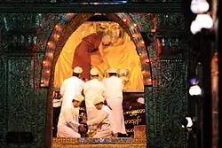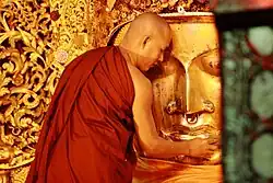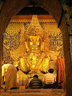 The Mahamuni Buddha Temple (Burmese: မဟာမုနိရှင်တော်မြတ်ကြီး, Burmese pronunciation: [məhà mṵnḭ pʰəjádʑí]) is a Buddhist temple and major pilgrimage site, located southwest of Mandalay, Myanmar (Burma).[1] The Mahamuni Image (lit. 'The Great Sage') is enshrined in this temple, and originally came from Arakan.[2] It is highly venerated in Burma and central to many people's lives, as it is seen as an expression of representing the Buddha's life.[3]