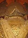 The Mahamuni Buddha image is housed in a small gandhakuṭi chamber, seated on a throne in a divine posture known as the Bhumisparsa Mudra. This posture or mudra symbolises Buddha's vanquishing of Mara). The legs are crossed with feet turned inwards, and the right hand touches the ground ritualistically, as a witness of his past deeds.[11] The image is cast in bronze and weighs 6.5 tonnes and is erected on a 1.84 metres (6.0 ft) high pedestal and reaches a height of 3.82 metres (12.5 ft).[11][27] Its shoulders measure 1.84 metres (6.0 ft) and its waist measures 2.9 metres (9.5 ft).[11][27] It is draped in royal costumes with "Brahmanic cords (salwe) and regalia crossing his chest".[27] The image is crowned, bejewelled with diamonds, rubies and sapphires. The left hand appears imprecise, unusually large, and is seen resting in the lap with an upturned palm.