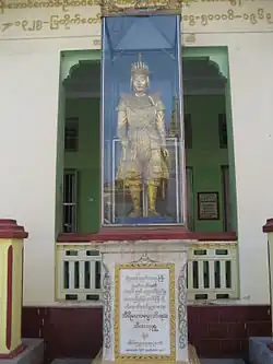 In the ancient history of Arakan, King Anawratha of Pagan (r. 1044–1077) attempted to move the image to Bagan, without success.[15] In 1784, the Burmese under the military leadership of Crown Prince Thado Minsaw of Konbaung dynasty conquered the Kingdom of Mrauk U.[16] The religious relics of the kingdom, including the Mahamuni Buddha image, were confiscated and installed in the Mahamuni temple or pagoda at Amarapura. Amarapura, located within modern-day Mandalay District, had recently become the new royal capital just two years prior. As the Mahamuni image was too large to transport as a whole, it was cut into sections and later reassembled and housed in the new temple.[17] Mandalay became the capital under King Mindon (r. 1853–1878).[18] It was also the capital under his son Thibaw (r. 1878–1885) of the Konbaung Dynasty (1752–1885). When the British annexed Upper Burma in 1885 to prevent the French from dominating it, monarchic rule ended.[19] However, veneration of the Mahamuni image has continued, and is visited and worshipped by many pilgrims, mainly Rakhine, Mon and Burmans peoples.[1][2][20][21]