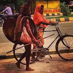 ![]() A Mahima sadhu from Odisha with the characteristic barada badi, palm-leaf fan symbolic of Mahimaism | |