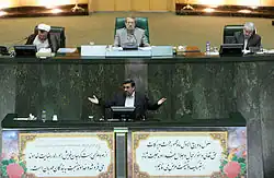 During his second term, Ahmadinejad experienced a power struggle with reformers and other traditionalists in Parliament and the Revolutionary Guard,[31] as well as with Supreme Leader Ali Khamenei,[32] over his dismissal of intelligence minister Gholam-Hossein Mohseni-Eje'i and his support for his controversial close adviser, Esfandiar Rahim Mashaei.[33] On 14 March 2012, Ahmadinejad became the first president of the Islamic Republic of Iran to be summoned by the Islamic Consultative Assembly (parliament) to answer questions regarding his presidency.[34][35] Limited to two terms under the current Iranian constitution, Ahmadinejad supported Mashaei's campaign for president.[31] In 2013, Hassan Rouhani was elected as Ahmadinejad's successor.