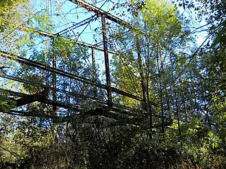 Two iron trusses, Camelback and Pratt, comprise the main structure and are positioned on metal caissons filled with concrete.[3] Overall length of the two truss spans is 335 feet (102 m). The deck was composed of wooden planking 18 feet (5.5 m) wide, but the deck was removed after the bridge was closed.