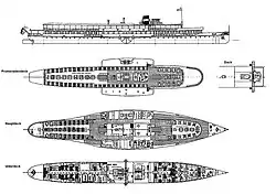 In the lower deck, which was equipped with eight transverse bulkheads for safety, the crew cabins and six rest cabins for passengers were located in the forward area during her active service. The two steam boilers and the steam engine were located in the middle of the ship, with further crew cabins and storage rooms behind them. On the main deck, an open deck was set up in the bow area, which was adjoined by a smoking saloon with 68 seats. In the wheelhouse on the port side there was a hairdressing salon, the passenger toilets, the checkroom, a luggage room and the inspector's office; in the starboard wheelhouse there was another crew cabin, the staff toilets, the ship's galley and two sculleries; large entrance areas in front of and behind the wheelhouses were each equipped with 16 seats. In the aft area was the steamer's dining room with seating for 172 guests. A covered open deck was installed aft. The viewing saloon, located on the protective deck in the forward half of the ship, was designed for 84 people and had an all-round paneled outdoor area. From the veranda in the midship, which was designed for 96 people, the operating steam engine could be viewed via an open shaft. The covered rear area of the deck offered space for 200 passengers, was open at the sides and secured with a railing.[2]