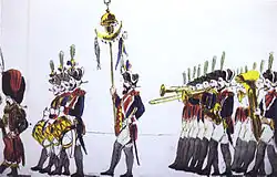 Two Mainz chair manufacturers, the city administration, and the military authorities provided 100 carriages. The carnival militia from the previous year became the Mainzer Ranzengarde, with 37 members and their general, Johann Maria Kertell, now appearing in electoral uniforms from the time of Elector Friedrich Karl Joseph von Erthal. They, along with the "Zwergen-Compagnie" (dwarf company) of costumed children, provided the military escort for the procession and were considered the bodyguards of Held Carneval.[6]