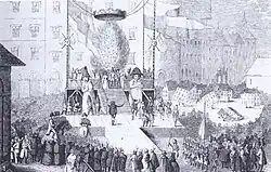 Heralds of the prince on horseback led the procession, followed by the Ranzengarde, flag bearers, and the Ranzengarde in their new uniforms, many with stuffed bellies and long braids. Held Carneval resided with his court on the accompanying carriages. The parade proceeded from the riding arena via Schlossplatz and Große Bleiche to the market square, where Held Carneval was ceremoniously enthroned and crowned king, receiving the homage of Mainz citizens. For the first time, a flag consecration ceremony and a recruit oath were held at the Ranzengarde, which remain typical elements of Mainz street carnival today. The first proper Mainz carnival campaign ended with a cap ride to the Neue Anlage.[6]