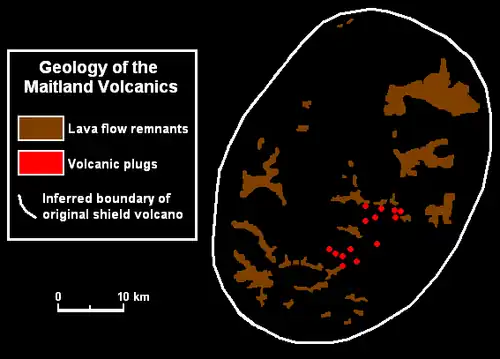 A cluster of 14 volcanic plugs are exposed that were originally under the central part of Maitland Volcano. These form steep-sided, isolated monoliths that reach heights of 150 m (490 ft) above the surrounding eroded terrain. They are circular to elliptical in shape, ranging in diameter from 100 to 250 m (330 to 820 ft). The plugs represent the principal feeders through which the Maitland lavas reached the surface. Red oxidized pyroclastic blocks surround some plugs protruding through the remaining lava flows. These probably formed not far below the surface where eruption was accompanied by vent-clearing explosions.[3]