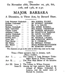 The play was first produced at the Court Theatre in London in 1905 by J.E. Vedrenne and Harley Granville-Barker. Barker also played Cusins, alongside Louis Calvert, Clare Greet, Edmund Gwenn, Oswald Yorke and Annie Russell. The Broadway premiere in the United States was at the Playhouse Theatre on 9 December 1915.