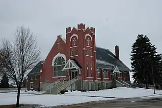 The exterior tabernacle is largely unchanged from its original appearance: the only modifications are the replacement of the wood-framed doors with metal-framed doors and the addition of metal railing to the entry steps,[2] as well as minor work done in 1985.[3] The one tall story of the red-brick building has a double-pitched end-gabled roof and rests on an elevated "look-out" basement. A parapeted, square corner tower (a tower set into the corner of a building) with white stone trim, which contains the main entrance, is outset from the Northeast corner of the building. The façade is also elaborated by a parapeted gable, also trimmed with white stone, and also with a molded belt course which follows the angle of the gable. A large tripartite (divided into three sections) window of primarily green stained glass centered in façade is round-headed, as are each of its three major sections. A white stone trim employing a stepped voussoir and a keystone motif is repeated above this window, the blind arches of the tower, and above the fan-lights over the front and side entrances. These entrances also have gabled overdoors, supported by volute-carved white wooden brackets.[2][3]
