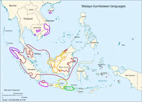![]() The Malayo-Sumbawan languages The languages in Cambodia, Vietnam, Hainan, and the northern tip of Sumatra are Chamic languages (purple). The Ibanic languages (orange) are found mostly inland in western Borneo, perhaps the homeland of the Malayic peoples, and across Sarawak, and other Malayic languages (dark red) range from central Sumatra, across Malaya, and throughout coastal Kalimantan. Sundanese (pink), Madurese (ocher), and the Bali–Sasak languages (green) are found in and around Java. | |