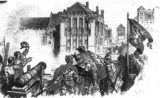 The Teutonic Order weakened greatly after the Battle of Grunwald against advancing Poles and Lithuanians.[7] The town was burned by the Teutonic Knights in 1410 before the siege of the castle by Poles,[6] however it remained under Teutonic control after the siege. In 1457, during the Thirteen Years' War, the castle was sold to Poland by Czech mercenaries of the Teutonic Knights,[6] and the Teutonic Order transferred its seat to Königsberg (now Kaliningrad, Russia). The town, under Mayor Bartholomäus Blume and others, resisted the Poles for three further years. But when the Poles finally took control, Blume was hanged and quartered, and fourteen officers and three remaining Teutonic knights were thrown into dungeons, where they met a miserable end.[3] A monument to Blume was erected in 1864,[4] after the town's annexation by Prussia in the Partitions of Poland.