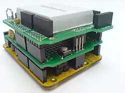 Another closely related type is the stackable connector for electronics, which typically has male pins on one surface and complementary female sockets on the opposite surface, allowing multiple units to be stacked up like plastic milk crates. Examples of this include stackable banana plugs, and interconnect cables specified for the IEEE-488 instrumentation bus. Stackable mezzanine bus connectors are used on some modular microcomputer accessory boards for systems such as the Arduino add-on daughterboards called shields. The older PC/104 embedded PC modules use a similar stackable format for interconnection. Stackable connectors are not classified as hermaphroditic in the strictest sense, but are often described as such in looser usage.