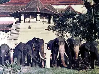 Raja (Sinhala: රාජා ඇතා - Raja Atha) (also known as Maligawa Raja, c. 1913 - 16 July 1988) was a Sri Lankan tusker elephant belonging to the Sri Dalada Maligawa temple in Kandy. Raja participated at the annual Esala procession in Kandy for around 50 years and was the sacred casket bearer of the final Randoli perehera for 37 years.[1] He was one of the most celebrated elephants in Asia during his lifetime, and was world famous for his noble behavior.[2] On 20 August 1986 former Sri Lankan President J. R. Jayewardene declared Raja as a national treasure, in recognition of his valuable services to the religion and culture of Sri Lanka.[3]