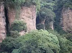 The best-known community outside of the municipal seat is Chalma, which is famous for being the sanctuary of the Lord of Chalma, an apparition of a crucified black Christ. Its small population is almost entirely dedicated to meeting the needs of pilgrims who come throughout the year.[18] According to legend, the Christ figure miraculously appeared at a cave where the pre-Hispanic local people used to worship a deity named Oxtoteotl.[19] Pilgrimages to this Christian sanctuary follow many of the patterns of the old pagan rituals, including walking the narrow paths to the town itself, bathing in the waters of a special fresh-water spring and dancing at the sanctuary.[20] Between Malinalco and Chalma there are large boulders, which according to legend, are people who have been turned to stone because they disobeyed this god. Near Chalma, because of the sanctuary, many famous people have bought ranches and other property. These include Verónica Castro, Daniela Romo, ex regent of Mexico City Oscar Espinoza Villareal and many politicians from Mexico State.[7]