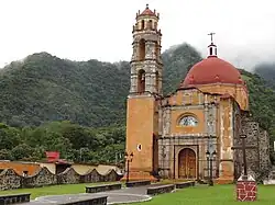 The Temple and ex-monastery of the Divino Salvador was built between 1540 and 1560.[13] This was an Augustine monastery, which was built to be the center of evangelization work in this area. It is located in the center of town and has a medieval look, with thick, coarse walls. The decoration is sober with square columns. The facade of the temple is a simple Plateresque and is quite high for a rural church.[8] The Plateresque elements include angels, rose windows and the conch shell friezes.[13] The interior of the monastery is covered in murals, which are the original from the 16th century, and is one of the earliest examples of mestizo art,[8] done by indigenous artists.[14] On the first level of the monastery, the murals depict the Garden of Eden story in an Aztec codex style.[13] The atrium of the monastery maintains its original dimensions, and the courtyard is filled with medicinal and alimentary plants. Animals such as monkeys, iguanas and opossums can be found as well. From the courtyard lead remnants of the paths that led to processional chapels. At the south of the property, there are seven arches. Some experts claim this was an open air chapel but others state they were simply entrance arches. Local legend links these arches to the first seven Augustine friars to arrive to New Spain.[8]