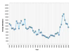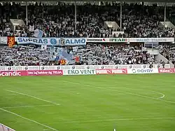 Malmö FF's average attendance at Malmö Stadion initially lay steady at around 15,000 per season from the mid-1960s to the early 1970s, before decreasing to around 10,000 spectators per season for the remainder of that decades.[13] During the 1980s and the 1990s, attendances decreased even further down to an average of around 5,000 fans per season; the general interest in Swedish football was also very low at the time.[13] Attendance took a sharp turn upwards during the 2001 season, Malmö FF's first season back in Allsvenskan after a season in Superettan. Average crowds then increased annually, and reached their peak during the 2004 season, when Malmö FF reached an all-time record average attendance of 20,061.[15] Attendances afterwards decreased each year, and were down to a seasonal average of 11,182 by the time of Malmö FF's final season at the ground. Only 6,580 attended Malmö FF's last Allsvenskan match at the stadium, on 9 November 2008.[23]