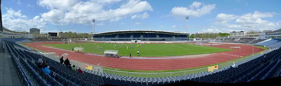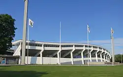Malmö Stadion, often known simply as Stadion before the construction of the new Stadion between 2007 and 2009, is a multi-purpose stadium in Malmö, Sweden. As of 2015, it is the home of association football club IFK Malmö, presently of Division 2, and athletics club MAI.[1] The stadium served as the home ground for Malmö FF, an association football team in Sweden's top flight, Allsvenskan, from its opening in 1958 until 2009, when the club moved to the newly constructed Stadion, built beside Malmö Stadion, in 2009. Malmö FF still use the stadium for training purposes and youth matches. Besides being used for sports, the stadium has also hosted various concerts and other events. The ground's record attendance, 30,953, was set in the first match played at the ground, a 1958 FIFA World Cup match between Argentina and West Germany.[2]
