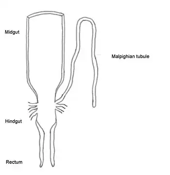 The Malpighian tubule system is a type of excretory and osmoregulatory system found in some insects, myriapods, arachnids and tardigrades. It has also been described in some crustacean species,[1] and is likely the same organ as the posterior caeca which has been described in crustaceans.[2][3][4][5][6]