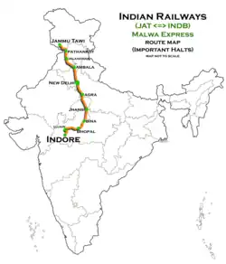 The 12919 / 12920 Malwa Express is a superfast express train service of the Indian Railways connecting Dr. Ambedkar Nagar of Madhya Pradesh and Shri Mata Vaishno Devi Katra of Jammu and Kashmir. It is currently being operated with 12919/12920 train numbers on a daily basis.[1][2]
