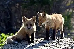 The red fox (Vulpes vulpes) is a small canid native to much of North America and Eurasia, as well as northern Africa. It is the most recognizable species of fox and in many areas it is referred to simply as "the fox". As its name suggests, its fur is predominantly reddish-brown, but there is a naturally occurring grey morph known as the "silver" fox. The red fox is by far the most widespread and abundant species of fox, found in almost every single habitat in the Northern Hemisphere, from the coastal marshes of United States, to the alpine tundras of Tibetan Plateau.