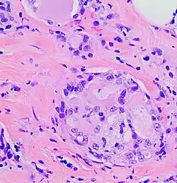 In 1980, Tavaosoli and Norris renamed juvenile breast carcinoma as "secretory carcinoma of the breast" based on its characteristic microscopic appearance[7] of having eosinophilic (i.e. red or pink) extracellular secretions when its tissues were stained with the H&E stain.[8] MSC has sometimes been termed secretory carcinoma without reference to its breast cancer location. However, the term secretory carcinoma has also been used to name tumors with the microscopic appearance of MSC that are localized in the salivary glands (now termed mammary analogue secretory carcinoma),[9] thyroid gland (now termed salivary gland–type carcinoma of the thyroid),[10] or skin (now termed secretory carcinoma of the skin or primary cutaneous mammary analog secretory carcinoma).[11][12] Mammary secretory carcinoma is used here to distinguish it from these formerly termed secretory carcinomas.
