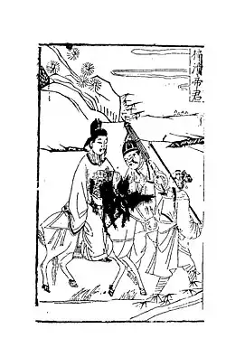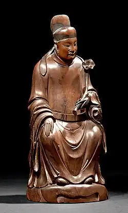 Wenchang Wang (Chinese: 文昌王; pinyin: Wénchāng Wáng; Pe̍h-ōe-jī: Bûn-chhiong Ông), also known as Wenchang Dijun (Chinese: 文昌帝君; pinyin: Wénchāng Dìjūn; Pe̍h-ōe-jī: Bûn-chhiong Tè-kun), is a Taoist deity in Chinese mythology, known as the God of Culture and Literature.[1] He is also at times referred to simply as Wen Qu, or Wen. The literal translation of his name would be King () of Flourishing () Culture/Language (). Wenchang Wang is physically represented by a constellation of six stars near the Big Dipper. The stars all had names of their own: Shangjiang (上將), Cijiang (次將), Guixiang (貴相o), Siming (司命), Sizhong (司中), and Silu (司祿). Wenchang Wang is often depicted as an elderly scholar accompanied by two attendants, Tianlong (天聾 or Heaven-Deaf) and Diya (地啞 or Earth-Mute).[2] He sometimes holds a pen and a book that says "Heaven determines literary achievement".[3] He has historically been called upon by scholars and writers who need inspiration or help right before an exam.