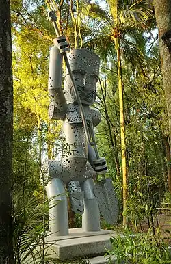 Also along the track, in the midst of native bush, stands the 6 metres (20 ft) tall metal sculpture of Whatonga, one of three recognised Māori chiefs on board the Kurahaupo Waka, which journeyed across the ocean to New Zealand.[23] The statue was funded by the Manawatu Gorge Biodiversity stakeholder group and is made of steel. It was lowered to its location in the bush by helicopter, and blessed at a dawn ceremony on 11 April 2014. The artwork on the sculpture features hammerhead shark patterns and depicts elements of the story of Whatonga's sea voyage, as well as emblems of all of the Manawatu Gorge biodiversity project stakeholders.[24]