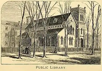 Once the public library proposal was suggested by Mayor Smyth, the Atheneum's collection was officially transferred to the city's possession on September 6, 1854, and was housed at 6 Patten Block off Elm Street, next to City Hall. It officially opened to the public November 8, 1854, with Francis B. Eaton as Head Librarian. His salary was $315.50 per year.[5] The collection started with fewer than 200 volumes.[6]