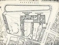 The hospital was founded at a time when only two other similar institutions existed in England (Bethlem and St Luke's)[2] and was initially located next to the Manchester Infirmary in 1763.[3] It was designed by Richard Lane in the Elizabethan style[1] and it opened as the Manchester Lunatic Hospital in 1766.[2] It had 24 beds when it opened, but had over 100 patients by 1800.[2]