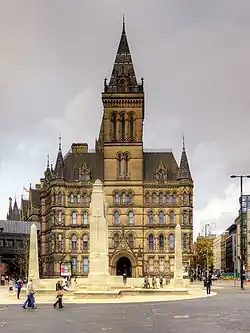 Manchester Town Hall is a Victorian, neo-Gothic municipal building in Manchester, England. It is the ceremonial headquarters of Manchester City Council and houses a number of local government departments. The building faces Albert Square to the north and St Peter's Square to the south, with Manchester Cenotaph facing its southern entrance.