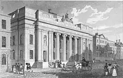 Manchester's original civic administration was housed in the Police Office in King Street. It was replaced by the first Town Hall, to accommodate the growing local government and its civic assembly rooms. The Town Hall, also located in King Street at the corner of Cross Street, was designed by Francis Goodwin and constructed between 1822 and 1825, much of it by David Bellhouse. The building was designed with a screen of Ionic columns across a recessed centre, in a classicising manner strongly influenced by John Soane. The building was 134 feet (41 m) long and 76 feet (23 m) deep, the ground floor housed committee rooms and offices for the Chief Constable, Surveyor, Treasurer, other officers and clerks. The first floor held the Assembly Rooms. The building and land cost £39,587.[6]