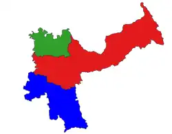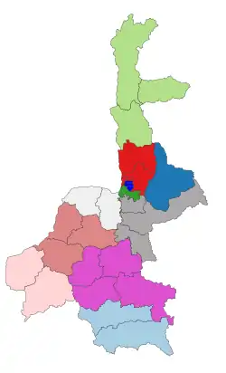 Mandalay Region (Burmese: မန္တလေးတိုင်းဒေသကြီး, pronounced [máɰ̃dəlé táiɰ̃ dèθa̰ dʑí]; formerly Mandalay Division) is an administrative division of Myanmar. It is located in the center of the country, bordering Sagaing Region and Magway Region to the west, Shan State to the east, and Bago Region and Kayin State to the south. The regional capital is Mandalay. To the south of the region lies the national capital of Naypyidaw. The division consists of eleven districts,[4] which are subdivided into 28 townships and 2,320 wards and village-tracts.